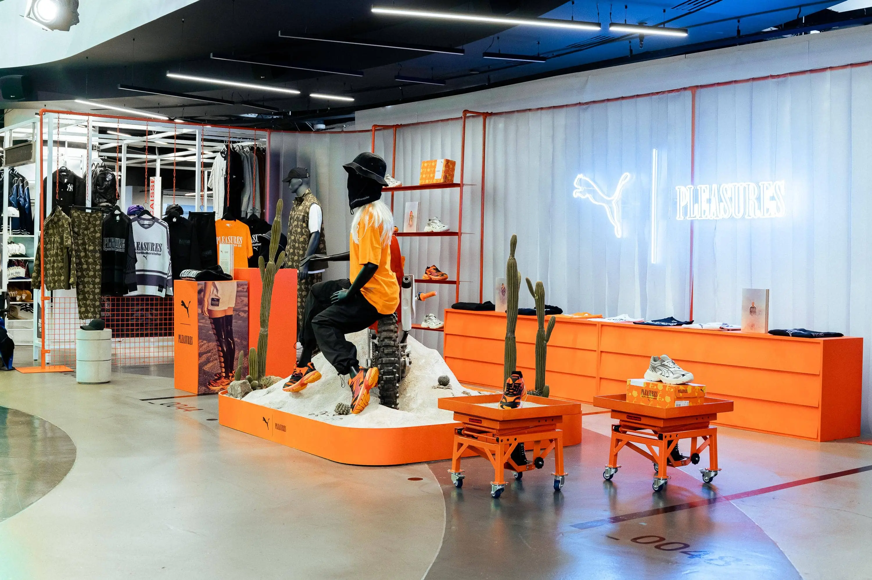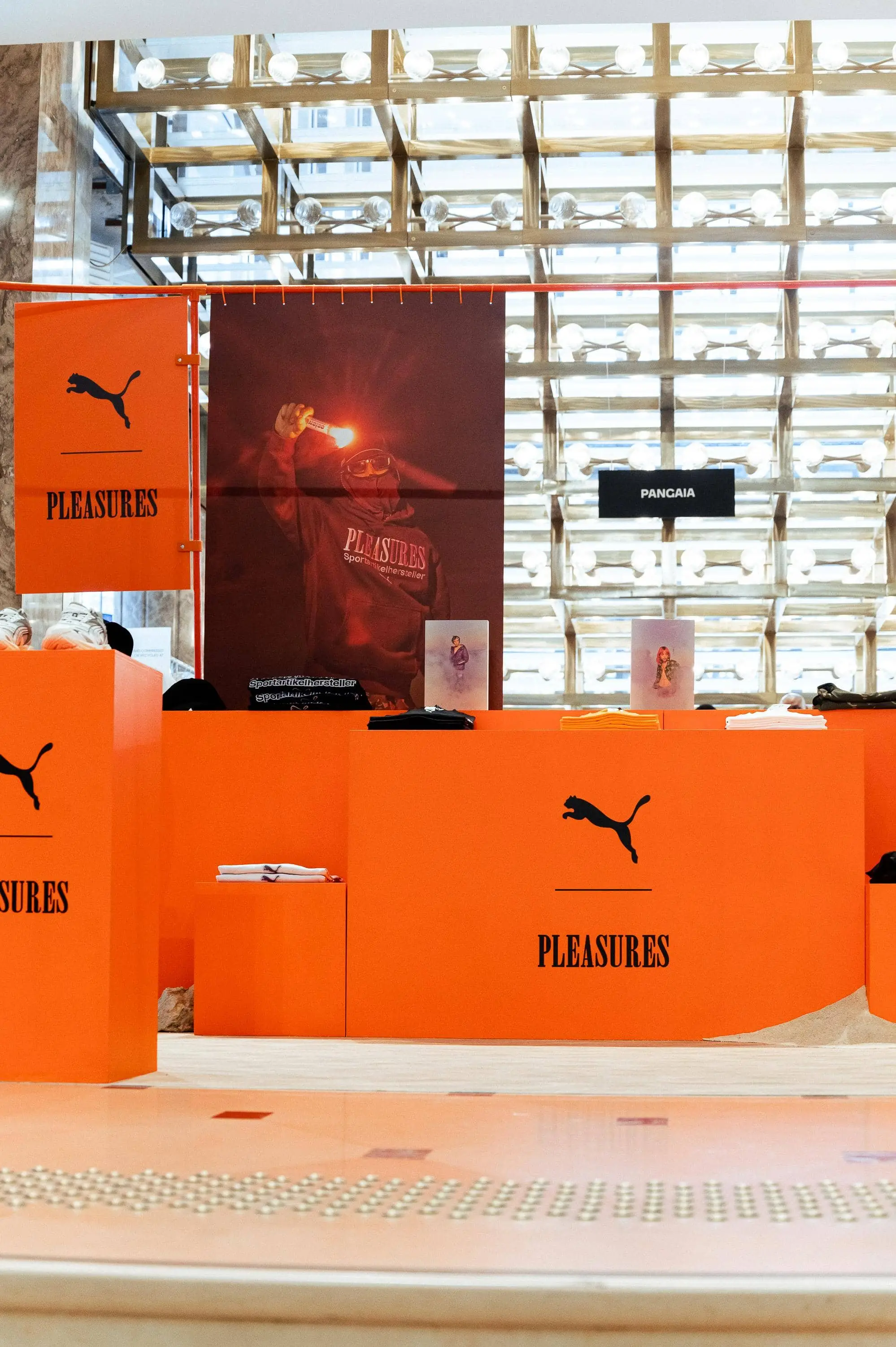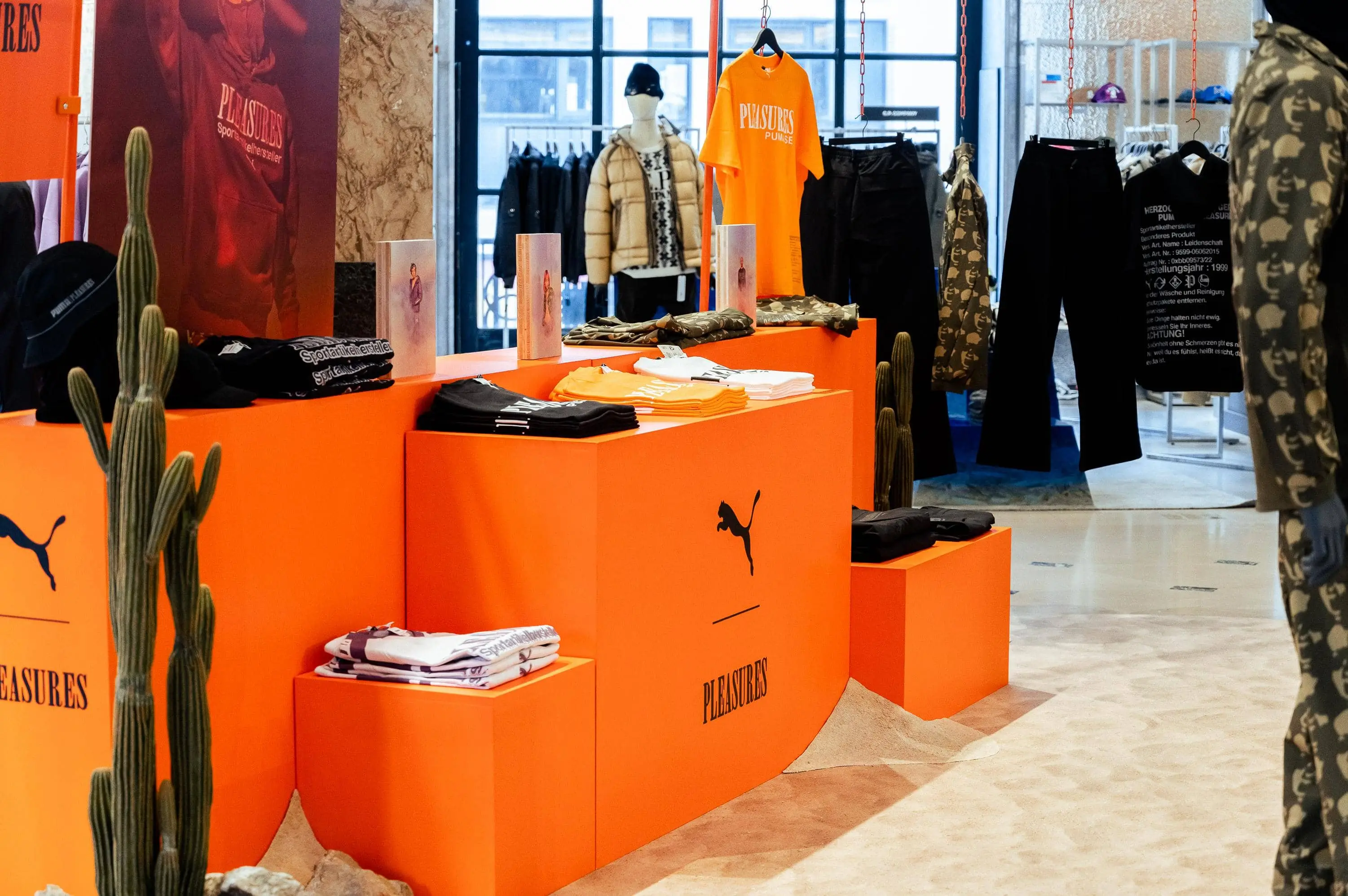 L’espace a été pensé selon une configuration en “Y”, permettant à la fois une dualité visuelle entre PUMA et PLEASURES et une rencontre dynamique entre les deux mondes. Le mobilier a été entièrement conçu sur-mesure, mêlant linéarité, couleurs fortes (dominante orange PUMA), et modules d’exposition intégrés. Le tout a été réalisé en collaboration avec l’agence FullSense et la designer Hélène Koch.