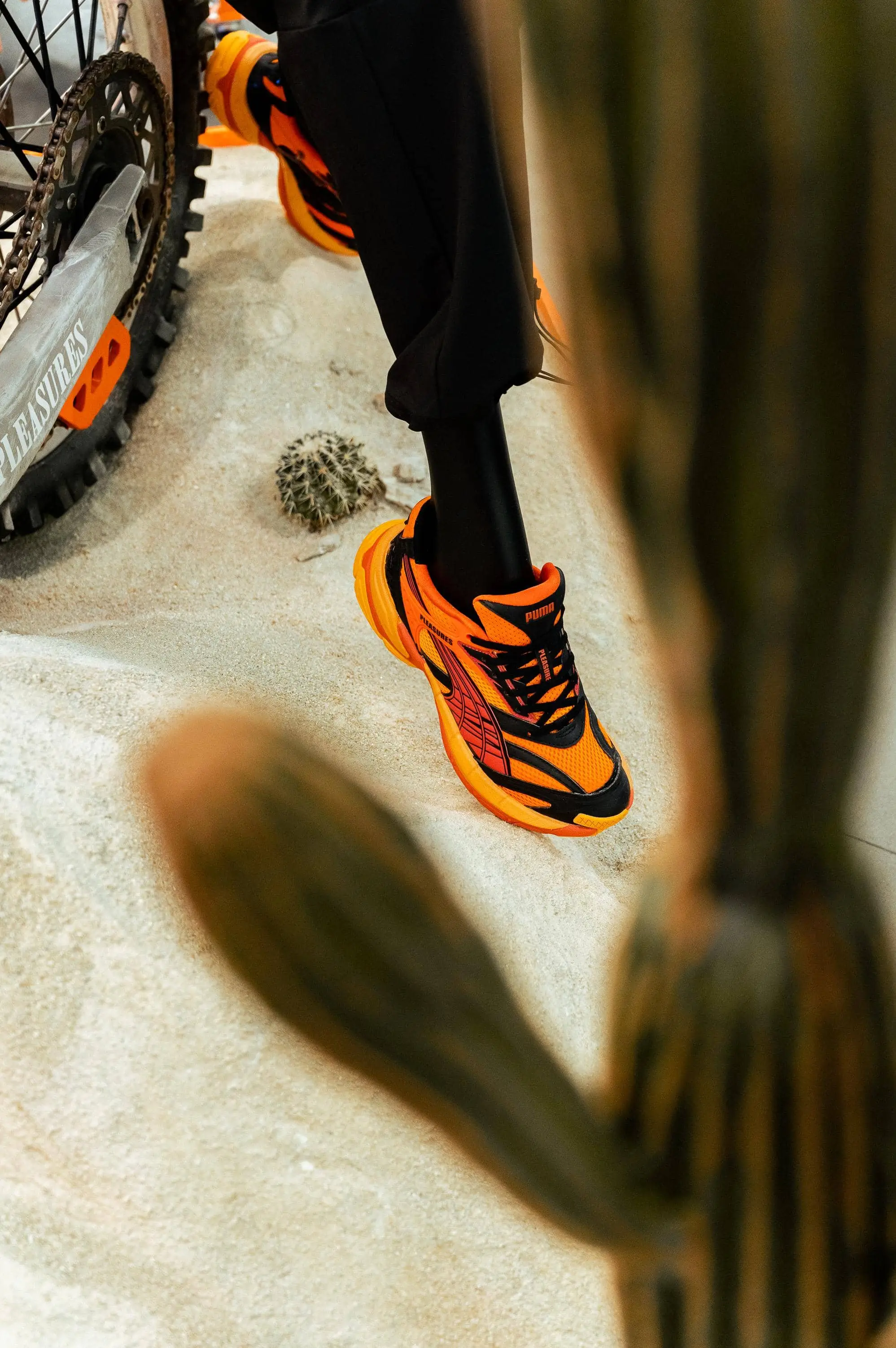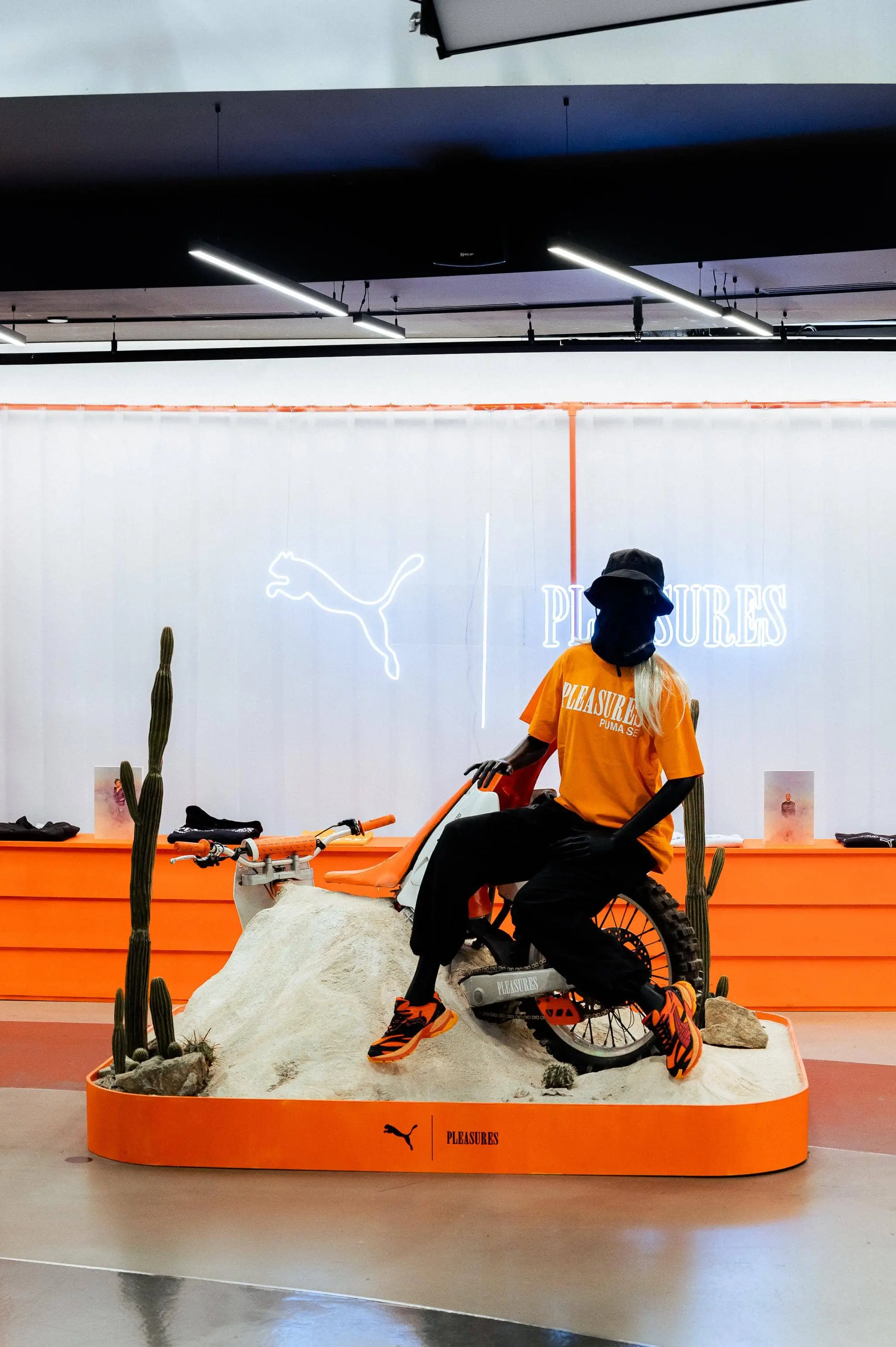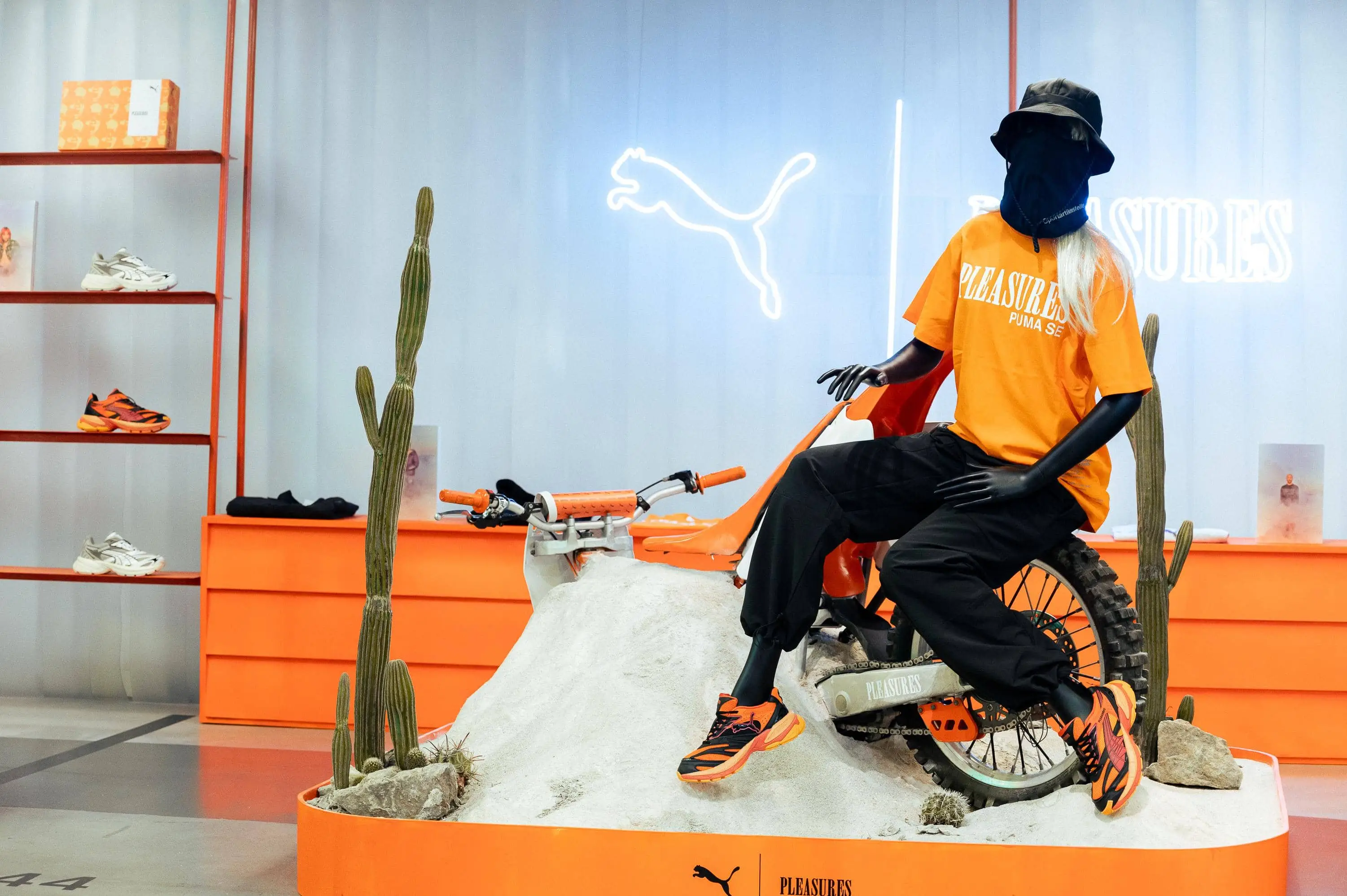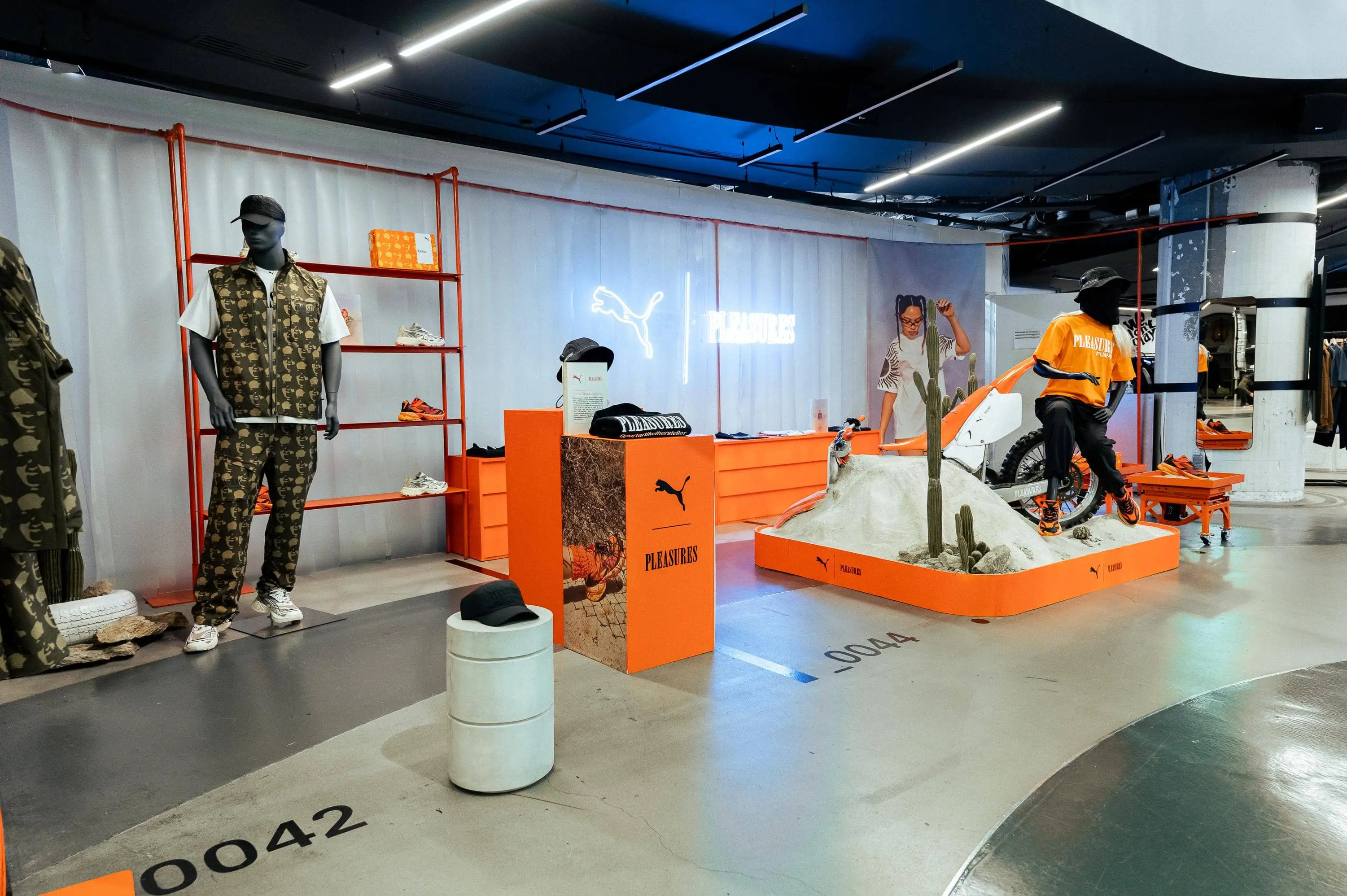 L’espace a été pensé selon une configuration en “Y”, permettant à la fois une dualité visuelle entre PUMA et PLEASURES et une rencontre dynamique entre les deux mondes. Le mobilier a été entièrement conçu sur-mesure, mêlant linéarité, couleurs fortes (dominante orange PUMA), et modules d’exposition intégrés. Le tout a été réalisé en collaboration avec l’agence FullSense et la designer Hélène Koch.