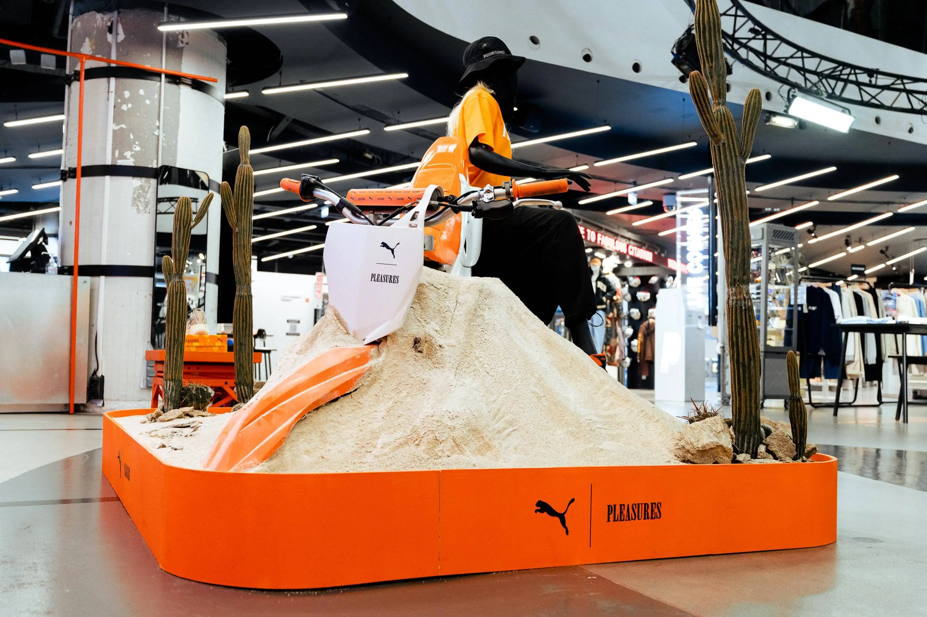 Pour la collaboration entre PUMA et la marque californienne PLEASURES, Studio AA a été mandaté pour concevoir la scénographie de l’espace retail chez Citadium Paris. L’objectif : créer un lieu immersif, à forte identité, incarnant les deux univers des marques.