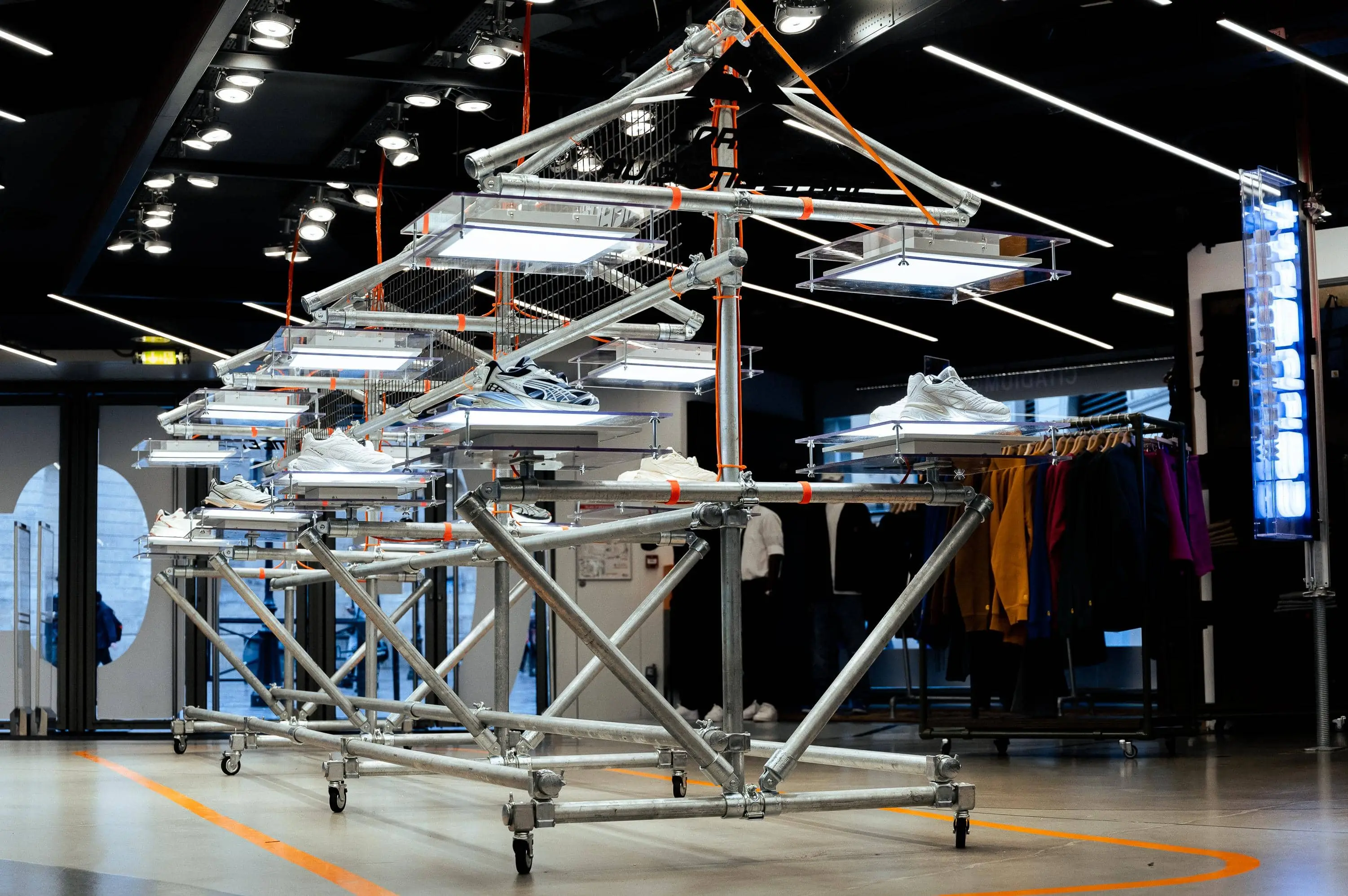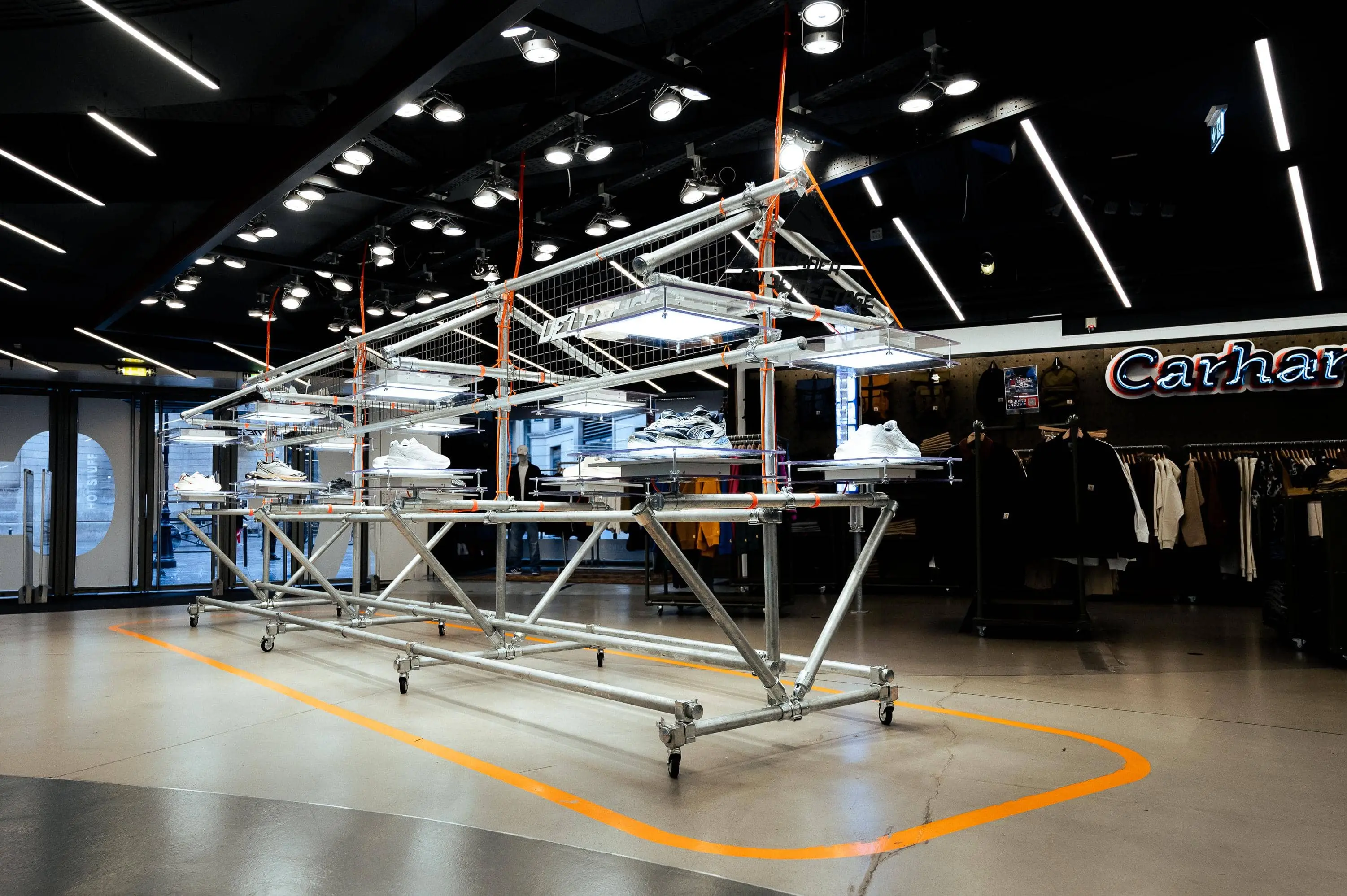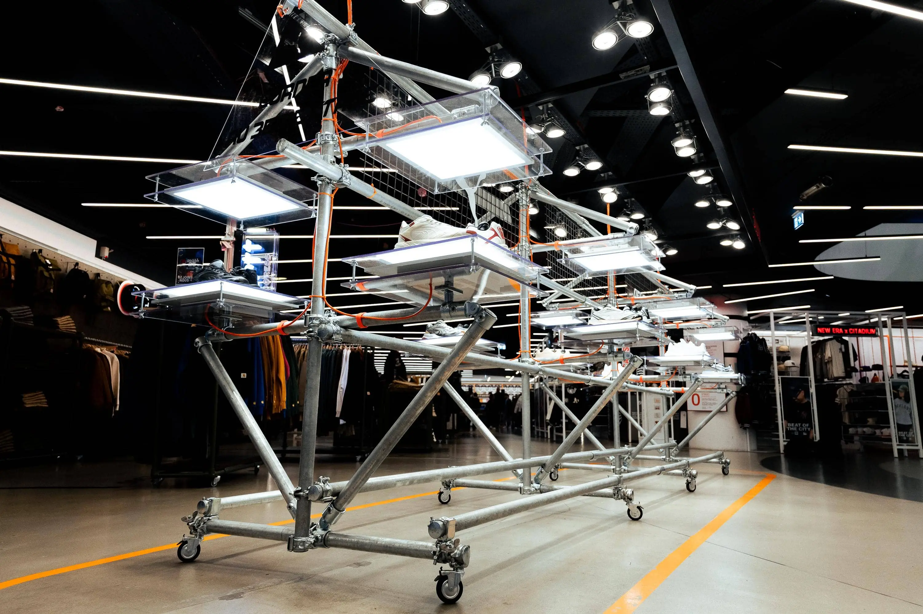 Notre mission : imaginer une structure capable de valoriser la sneaker dans un environnement retail tout en incarnant l’univers de la collaboration. Inspirée des codes industriels, la scénographie s’appuie sur un assemblage de tubes métalliques bruts, rigides mais modulaires, évoquant une esthétique technique et urbaine. Des plateaux lumineux LED suspendus viennent découper l’espace et créer une mise en lumière directe et sculpturale du produit.