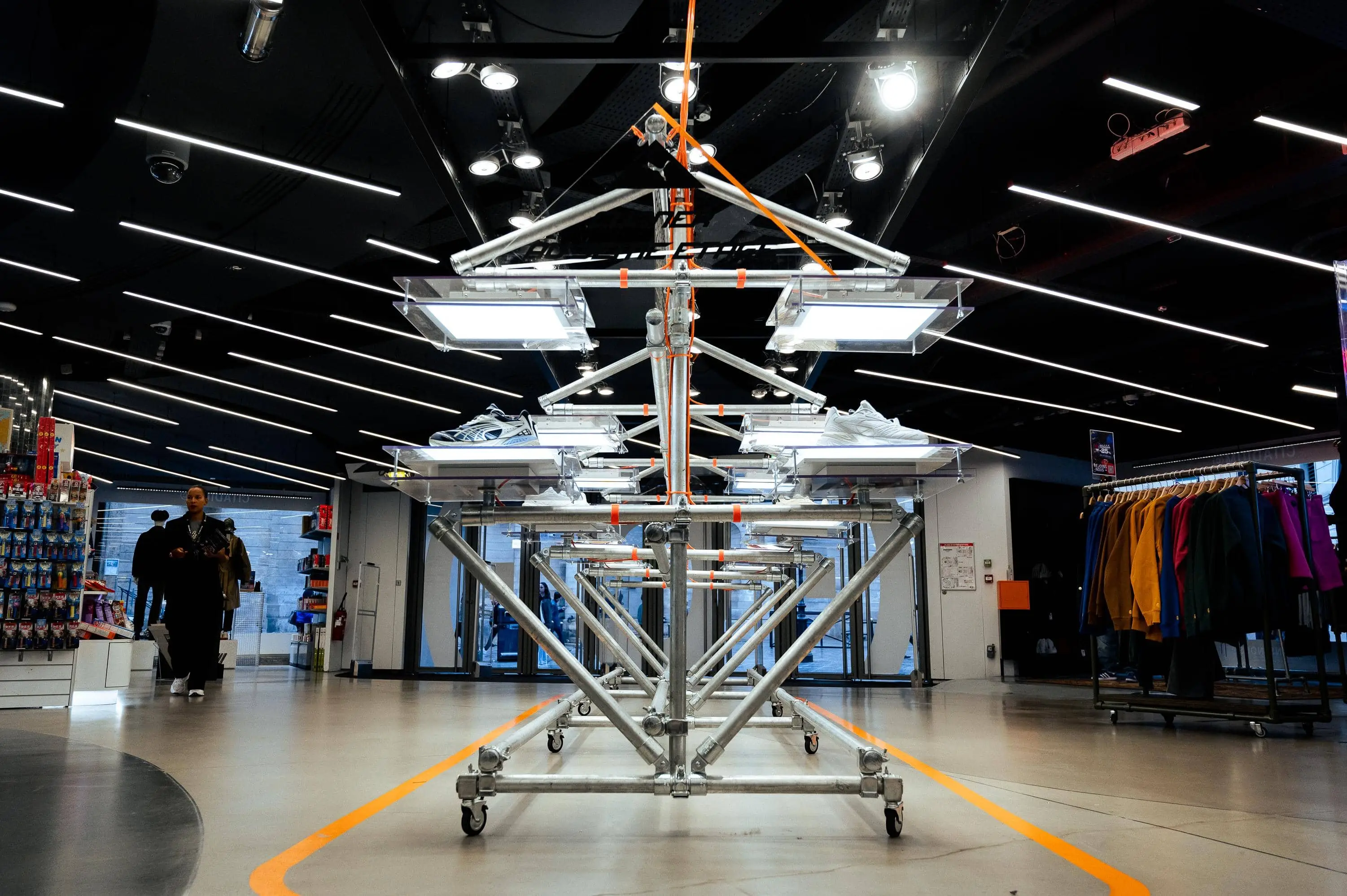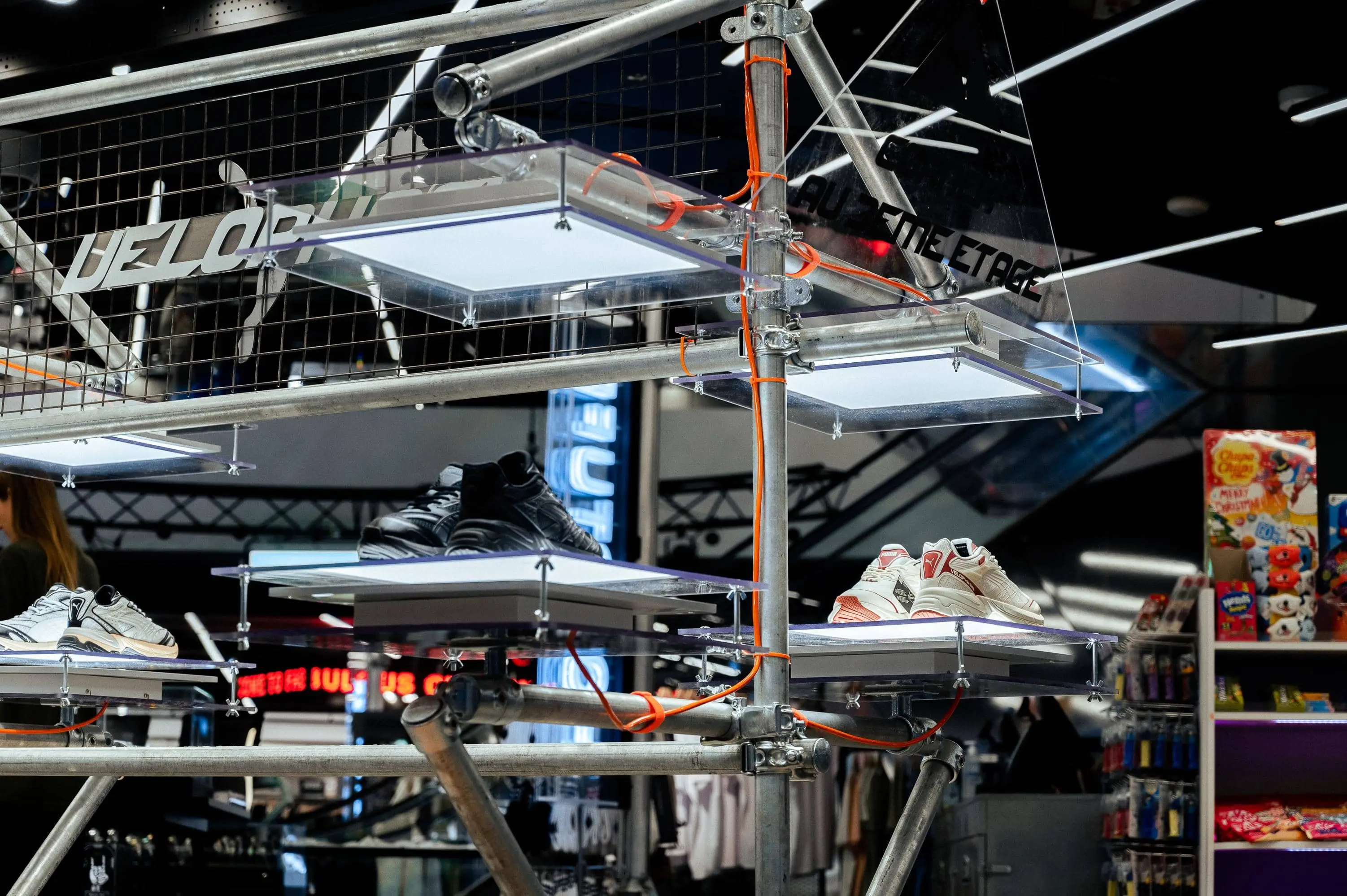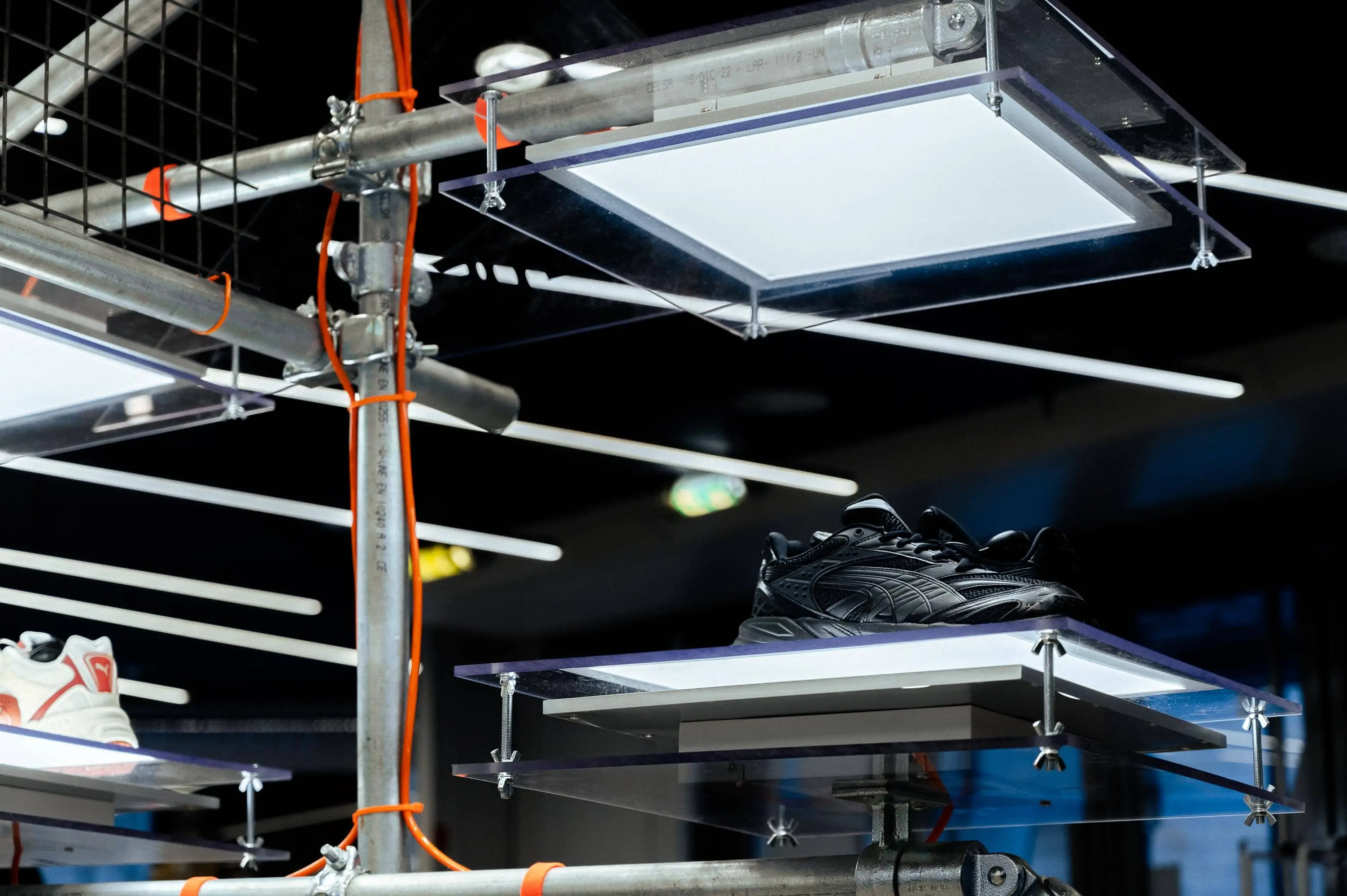 Notre mission : imaginer une structure capable de valoriser la sneaker dans un environnement retail tout en incarnant l’univers de la collaboration. Inspirée des codes industriels, la scénographie s’appuie sur un assemblage de tubes métalliques bruts, rigides mais modulaires, évoquant une esthétique technique et urbaine. Des plateaux lumineux LED suspendus viennent découper l’espace et créer une mise en lumière directe et sculpturale du produit.
