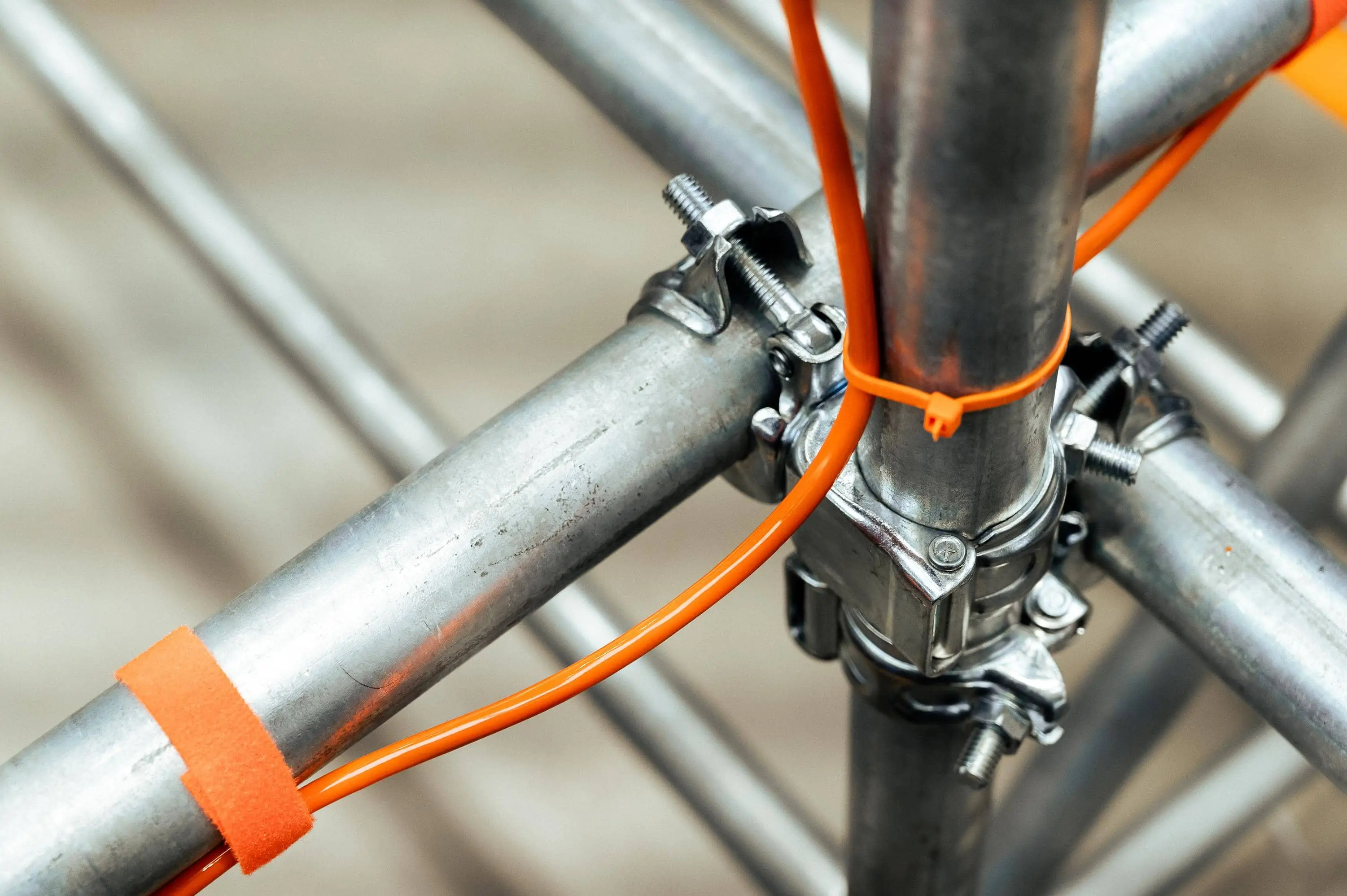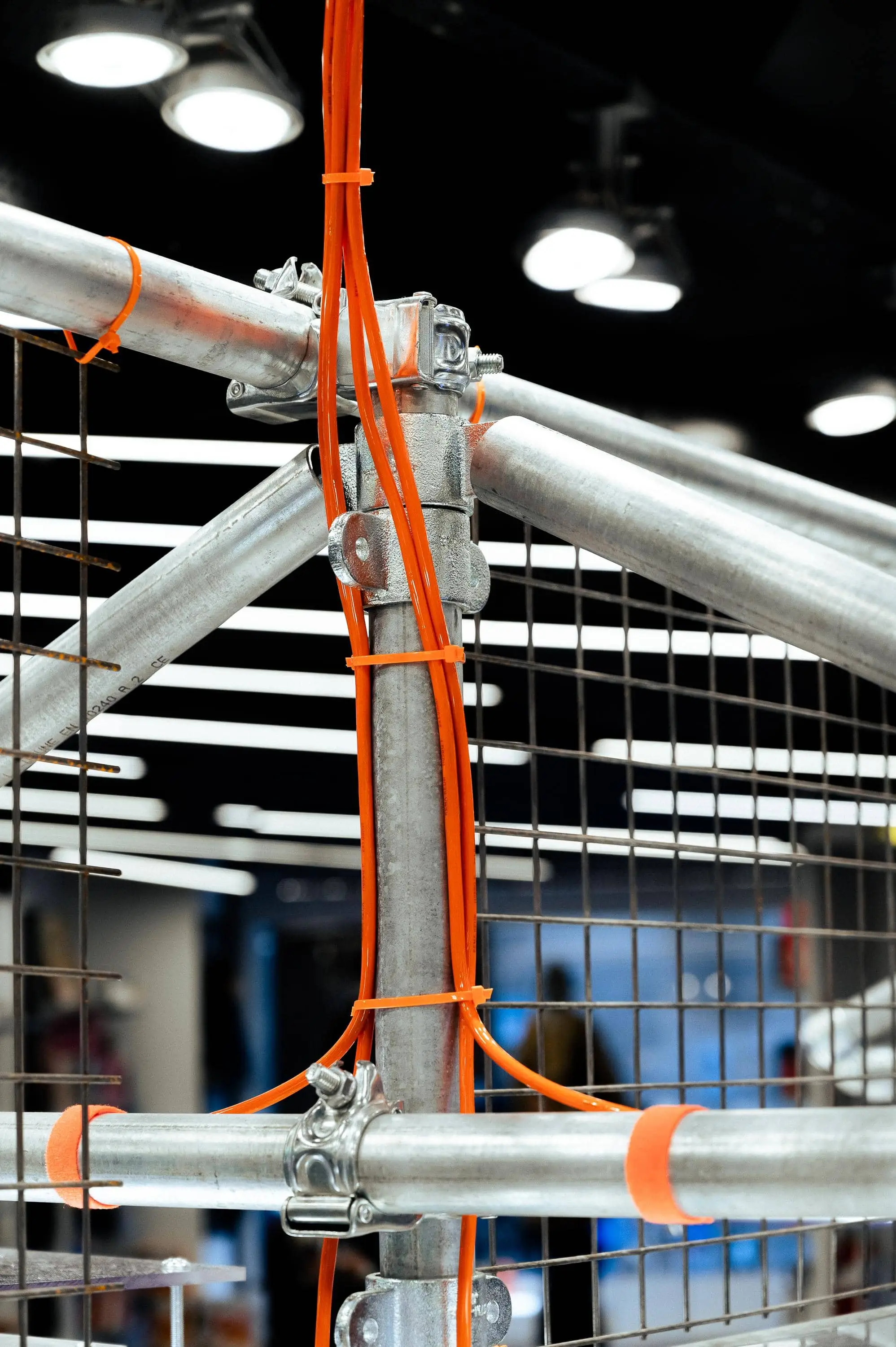 La structure, pensée comme un support actif, articule tubes métalliques bruts, lignes tendues et volumes lumineux.